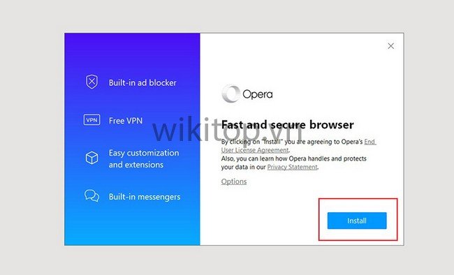 Bước 1: Tải trình duyệt Opera về máy > Khởi chạy Opera Installer > Chọn Install