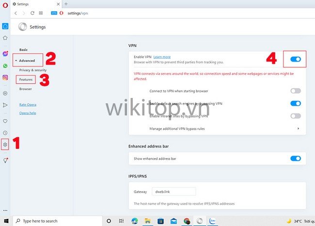 Bước 2: Sau khi cài đặt > Mở trình duyệt Opera > Chọn Setting (Cài đặt) > Chọn Advanced (Nâng cao) > Chọn Features > Bật công tắc để kích hoạt VPN là hoàn tất.