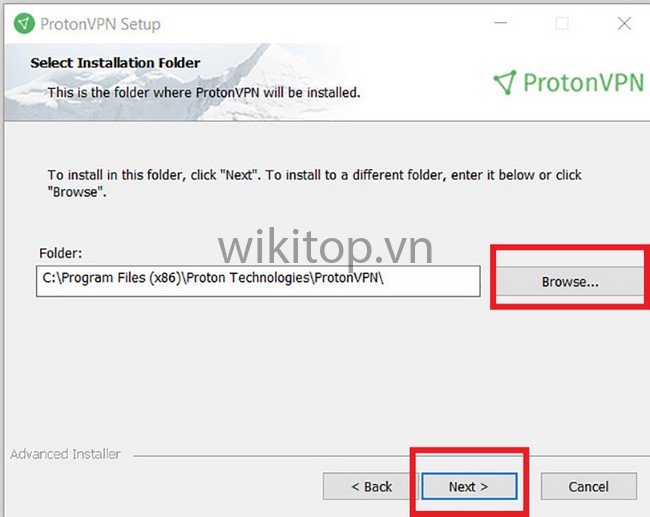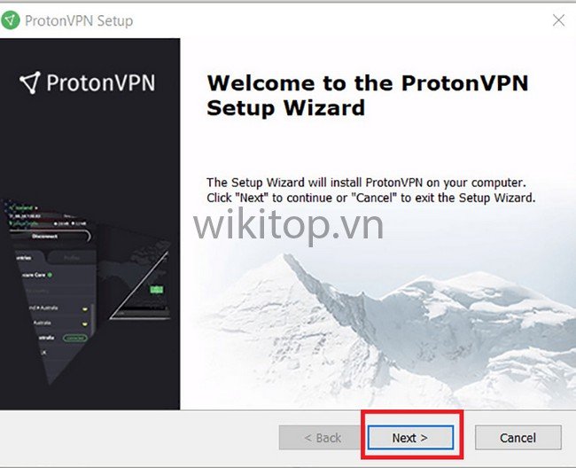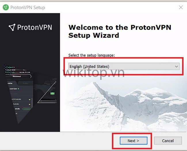 Bước 1: Tải ứng dụng Proton VPN về máy tính > Chọn ngôn ngữ Anh/chị muốn > Chọn Next (Tiếp tục) > Chọn Next lần 2 .