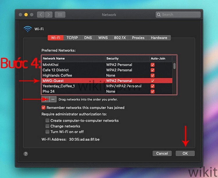 Bước 4: Chọn mạng WiFi Anh/chị muốn xóa sau đó nhấn dấu “-“, cuối cùng click vào OK.