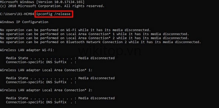 Bước 2: Anh/chị nhập ipconfig /release sau đó Enter.