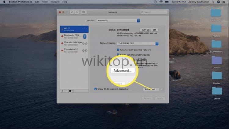 Bước 3: Chọn mục WiFi và nhấn vào Advanced.