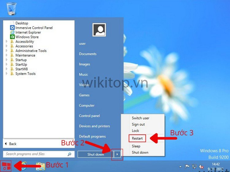 Tương tự, để khởi động laptop Windows 7,8, Anh/chị nhấn vào biểu tượng Start, click vào mũi tên bên cạnh nút Shutdown rồi chọn Restart.