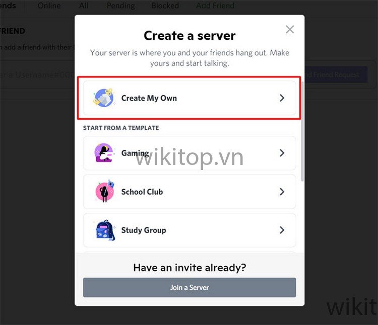 Bước 1: Để tạo server Discord, Anh/chị chọn vào Create My Own.