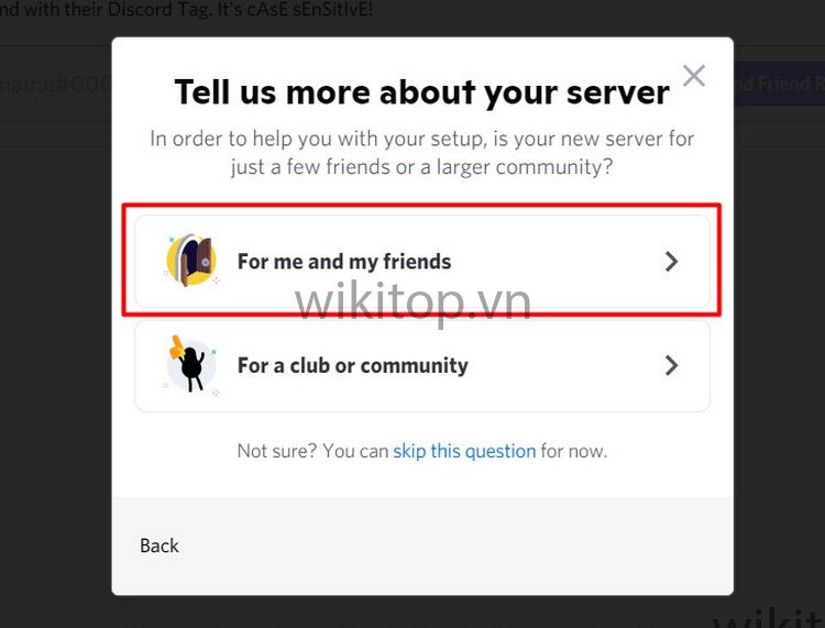 Bước 2: Sau đó, Anh/chị chọn chọn đối tượng tham gia server. Ở đây mình chọn tạo server dành cho mình và nhóm bạn bè (For me and my friends).