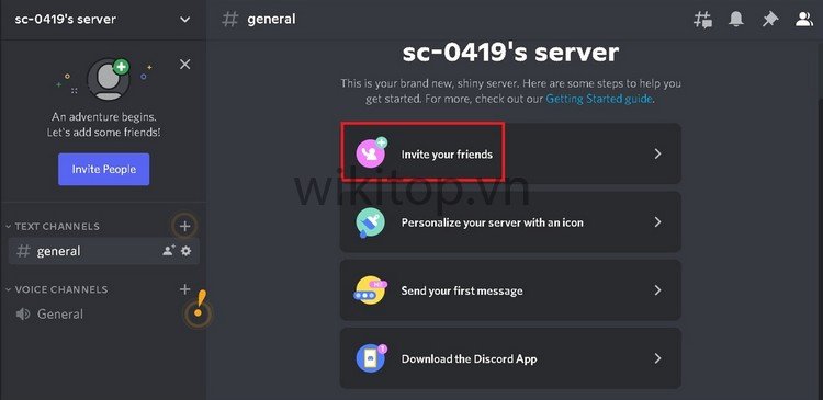 Bước 4: Màn hình server của Anh/chị sẽ hiện ra. Tại đây, Anh/chị chọn Invite your friends để mời bạn bè vào server.