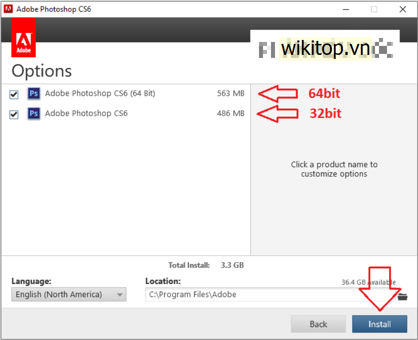 Bước 3: Tại đây Anh/chị có thể tùy chọn phiên bản 32 Bit hoặc 64 Bit tương thích với máy Anh/chị nhé. Nếu không rõ thì cứ để mặc định và chọn Install như hình