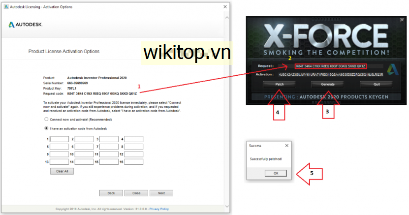 Bước 9: Copy Request code và paste vào Request của phần mềm cr@ck như hình. Chọn Generate tiếp theo chọn Patch. Hiện thông báo Successfully patched như hình là đươc.
