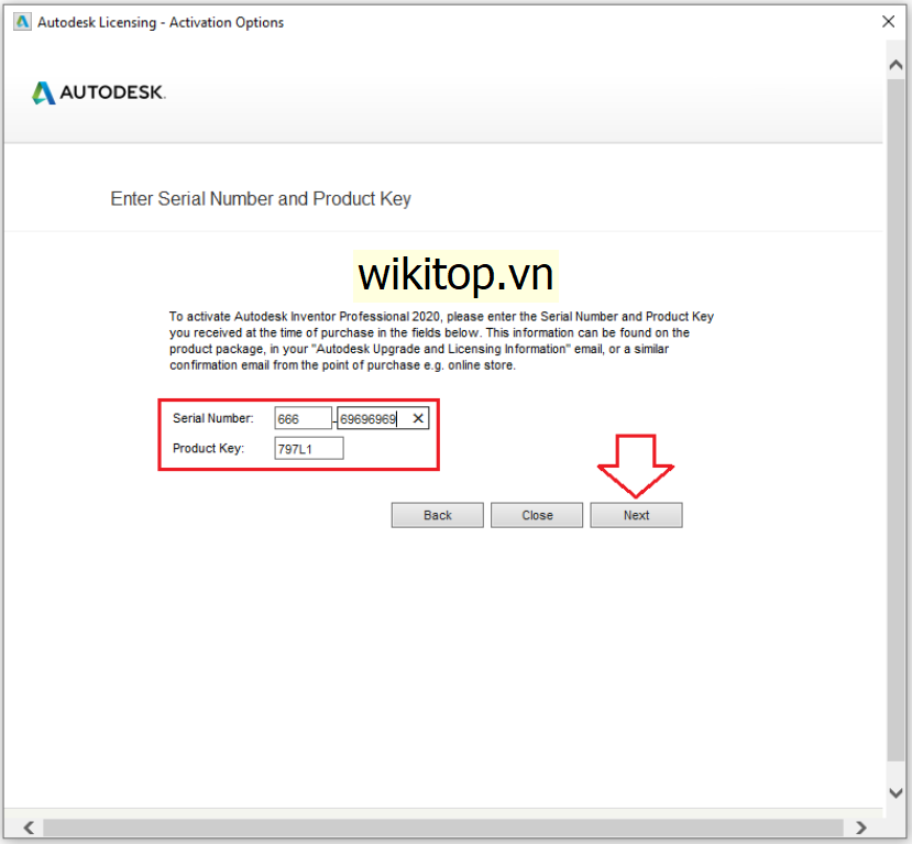 Bước 6: Nhập Serial Number: 666-69696969, Product code: 797L1 đối với Autodesk Inventor Professional 2020, và 208L1 đối với Autodesk Inventor 2020. Sau đó tùy chọn như hình dưới…