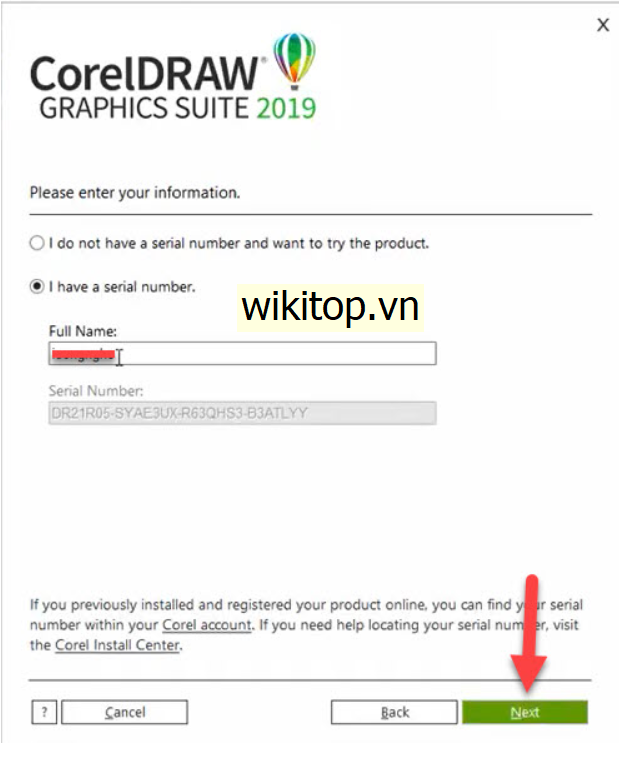 - Chọn Next. Nó sẽ tự động điền key coreldraw graphics suite 2019 cho Anh/chị nhé.