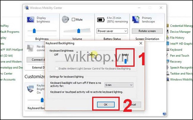 Để bật đèn bàn phím thông qua Windows Mobility Center Anh/chị hãy thực hiện bằng cách như sau: