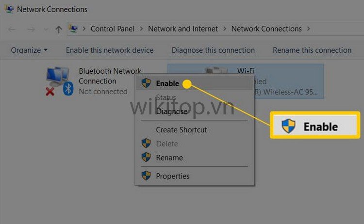 Bước 5: Anh/chị nhấn chuột phải vào Bluetooth Network Connection (Kết nối mạng Bluetooth), chọn disable để bật hoặc enable để tắt Bluetooth.