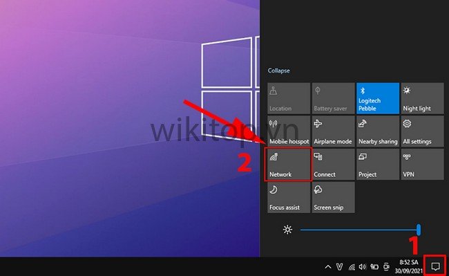 Bước 1: Vào mục thông báo của Windows 10 trên Taskbar > Chọn biểu tượng Wi-Fi.