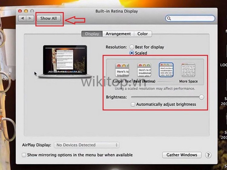 - Bước 2: Chọn biểu tượng Displays> chọn tab Arrangement trong thanh trình đơn.