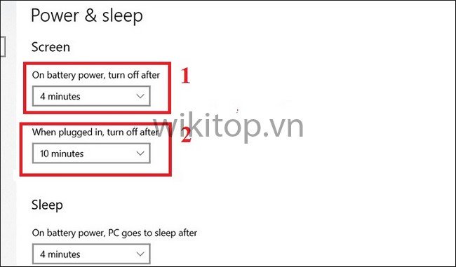 Bước 3: Lúc này, trong phần Screen, Anh/chị điều chỉnh thời gian ở 2 mục: On battery power, turn off after (Khi bật nguồn, tắt sau) và When plugged in, turn off after (Khi cắm sặc, tắt sau).