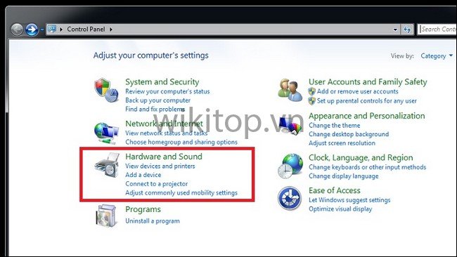 Bước 2: Bạn chọn Hardware and Sound (Phần cứng và âm thanh)