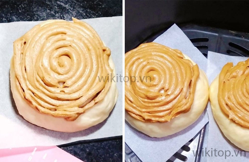 - Đầu tiên, Anh/chị cắt một lỗ nhỏ của túi bắt kem rồi phun phủ một lớp cà phê theo hình xoắn ốc lên mặt phần bột đã ủ xong 45-50 phút.