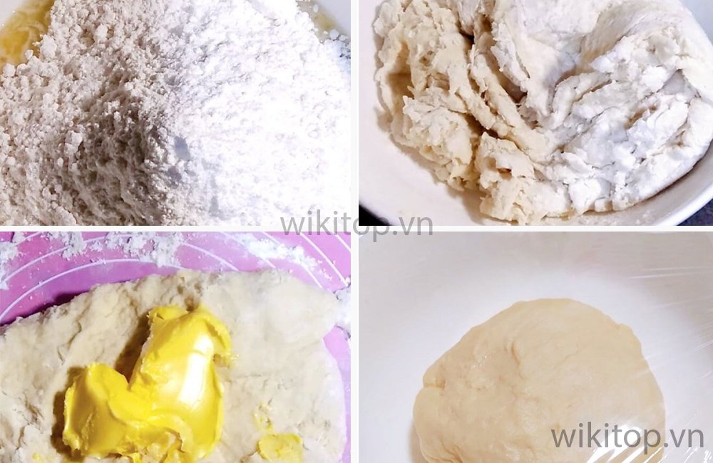 - Bước 3: Cho bột ra bàn sạch, thêm vào 40gr bơ và dùng tay nhồi bột với thao tác đẩy bột ra xa và kéo bột lại cho đến khi khối bột mịn màng.