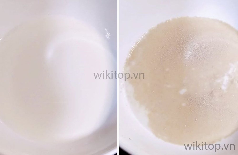 - Để kích hoạt men, Anh/chị cho vào một chiếc tô lớn 60ml nước, 60ml sữa tươi, 5gr men, 50gr đường và trộn đều.