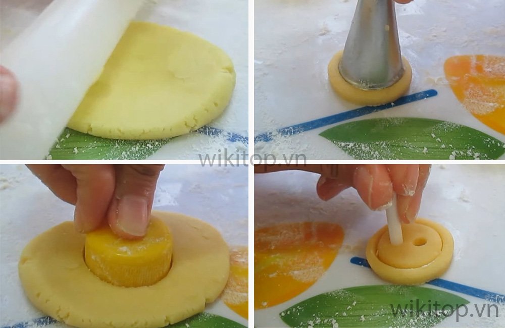 • Dùng 1 cái nắp chai để cắt bột, sau đó bạn dùng 1 khuôn tròn nhỏ hơn để ấn tạo đường viền bên trong.