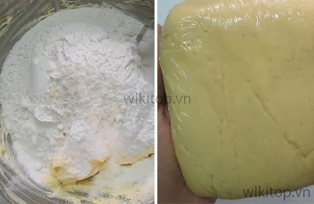 • Cho vào tô bơ 120gr bột mì, 2gr muối, 1 ít tinh chất vani rồi trộn đều đến khi bột hòa quyện, tạo thành khối.