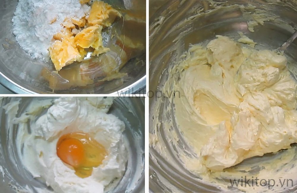 • Cho vào tô 125gr bơ lạt, 80gr đường rồi dùng máy đánh bông bơ.
