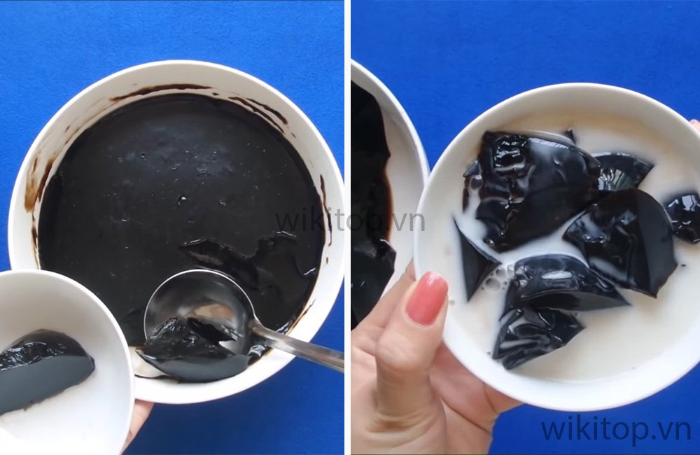 - Sau khi bỏ trong ngăn mát tủ lạnh 2 tiếng, vậy là đã có ngay những miếng thạch sương sáo mềm mịn.
