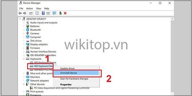 Bước 3: Nhấn chuột phải vào tên bàn phím Anh/chị muốn khóa, sau đó chọn Uninstall device.