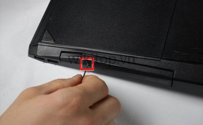 Trước khi Anh/chị tháo ổ đĩa, hãy đảm bảo laptop của Anh/chị đã được tắt máy. Sau đó, Anh/chị sử dụng kẹp giấy (hoặc cây kim) rồi đưa vào lỗ nhỏ được thiết kế trên ổ đĩa. Khi cảm nhận được vật cản, Anh/chị chỉ cần nhấn nhẹ kẹp giấy để cho khay đĩa được bật ra.