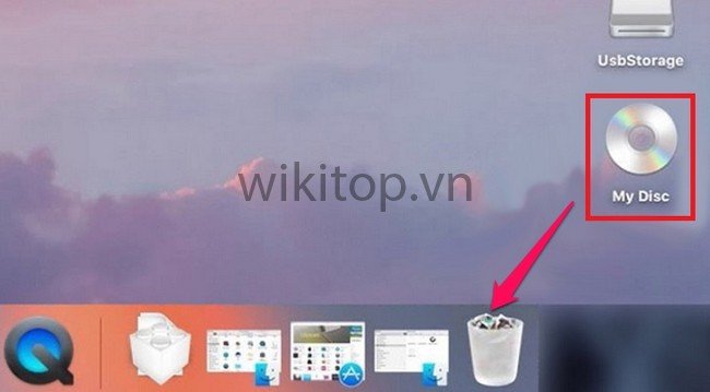 Thay vì thao tác trên bàn phím, Anh/chị có thể mở ổ đĩa MacBook bằng cách thực hiện trên màn hình laptop. Hãy dùng chuột kéo biểu tượng đĩa CD vào thùng rác nằm ở phía dưới góc bên phải màn hình. Như vậy, Anh/chị đã mở được ổ đĩa trên MacBook.