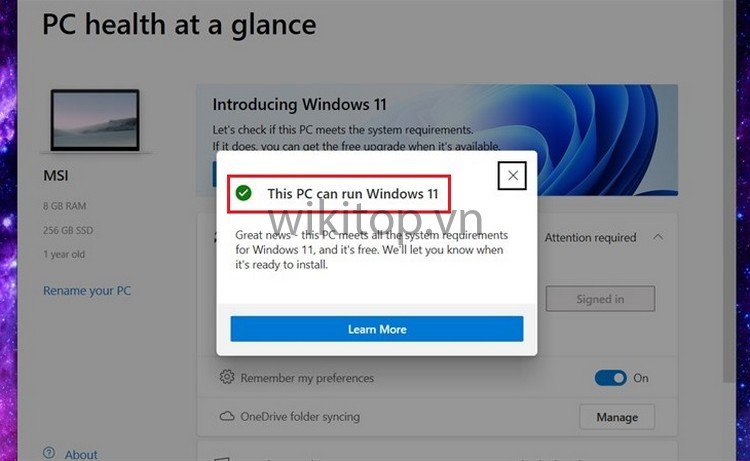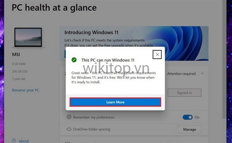 Bước 4: Anh/chị có thể nhấn Learn more để tìm hiểu thêm thông tin về Windows 11 và các câu hỏi thường gặp về hệ điều hành này.