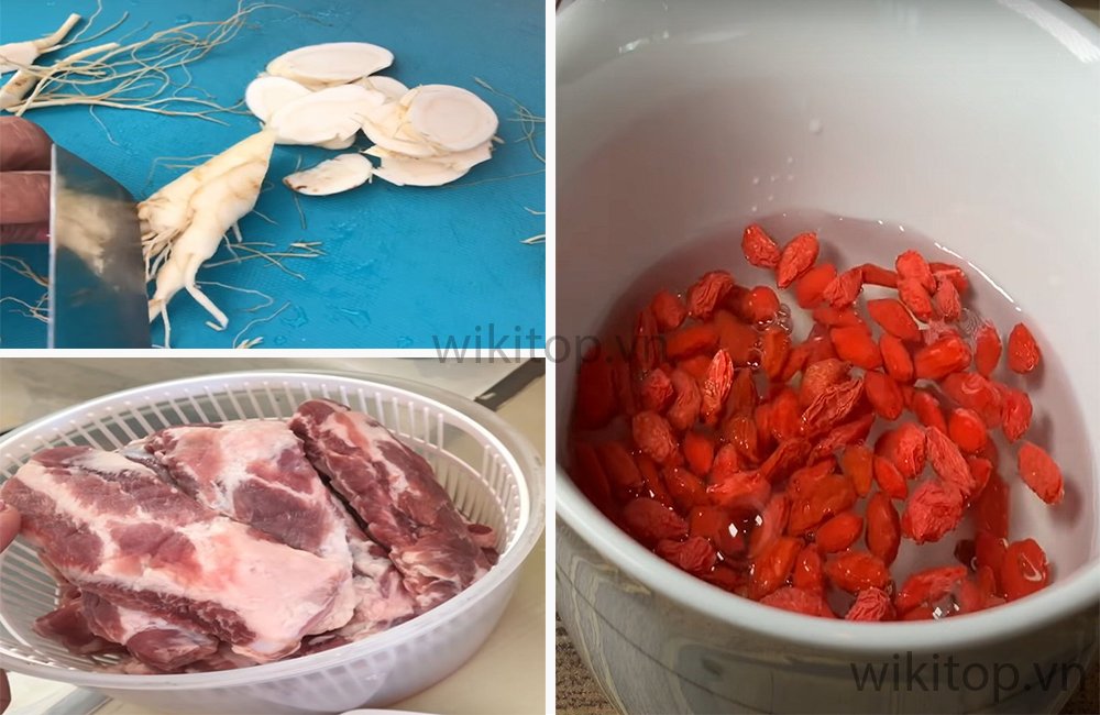 - Khi mua sườn heo về Anh/chị rửa với nước muối loãng rồi rửa sạch lại với nước 2-3 lần, để ráo. Táo đỏ, kỷ tử Anh/chị đem đi ngâm với nước khoảng 15-20 phút, rửa sạch và để ráo.