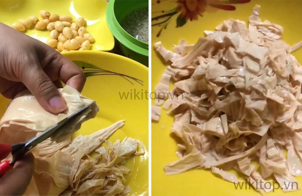 - Tiếp đó, dùng kéo cắt tàu hũ ky đã ngâm mềm thành các miếng nhỏ vừa ăn rồi cho ra tô.