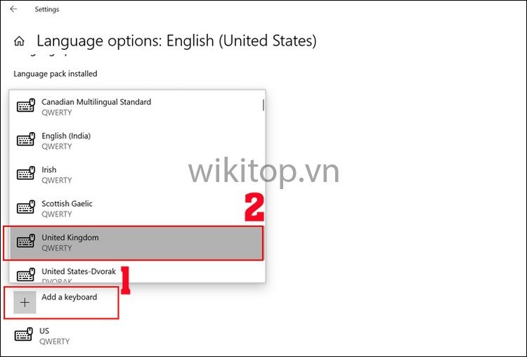 Bước 4: Chọn vào mục Add a keyboard tiếp tục chọn chuẩn bàn phím mới cho máy của Anh/chị. Nếu bàn phím cũ Anh/chị đang sử dụng là United States, thì hãy đổi sang United Kingdom.
