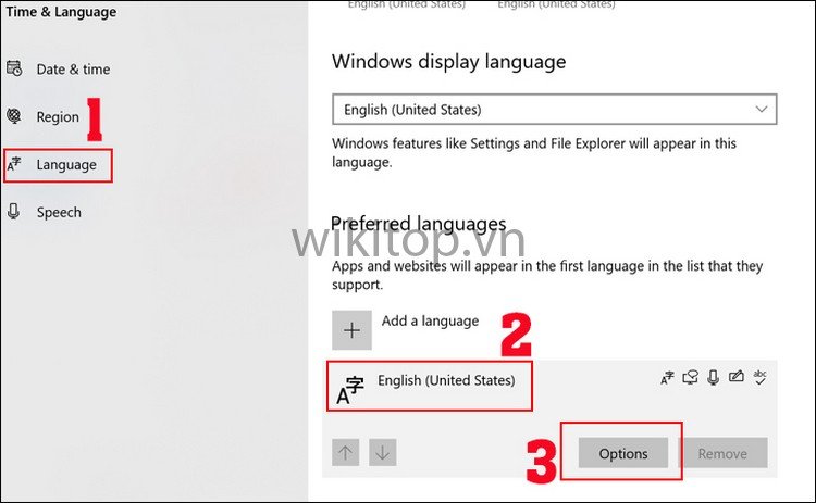 Bước 3: Chọn Language, xuất hiện dòng Preferred language sau đó sẽ xuất hiện ngôn ngữ => nhấn vào ngôn ngữ đầu tiên được hiển thị => chọn Options.