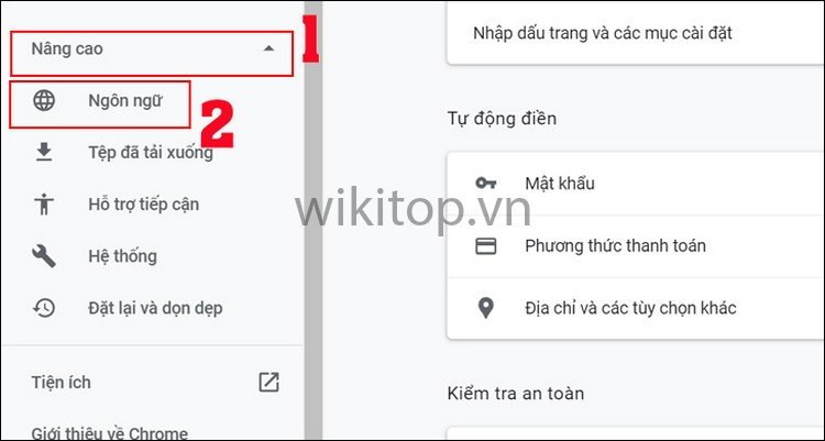 Bước 2: Nhấn vào mục Nâng cao => Chọn Ngôn ngữ.