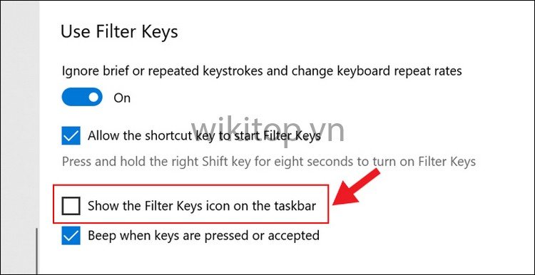 Bước 4: Trượt xuống ở ô Show the Filter keys icon on the taskbar chuyển sang trạng thái không hiển thị dấu tích.