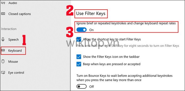 Bước 3: Chọn Keyboard ở khung bên trái cửa sổ Ease of Access. Ở mục Use Filter Keys => trượt chế độ ON sang OFF ở mục Ignore or slow down brief or repeated keystrokes and adjust keyboard repeat rates.