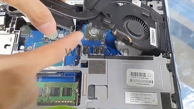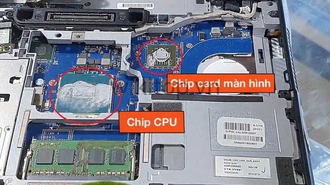 Sau khi thấy được board mạch bên trong, Anh/chị xác định vị trí chip CPU của laptop. Tiếp đó, tùy theo mỗi dòng laptop, Anh/chị tiến hành tháo dỡ các phần có liên kết với CPU để làm lộ ra chip CPU và card màn hình.