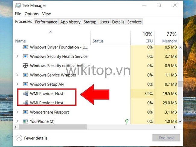 Bước 2: Nếu Anh/chị thấy trong Processes có tiến trinh đang chạy trên WMI Provider Host (WmiPrvSE.exe), thì Anh/chị hãy dừng nó lại.