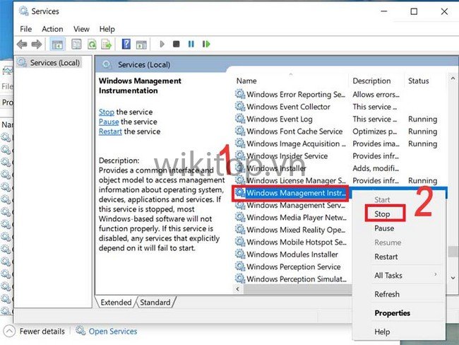 Bước 4: Anh/chị tìm file Windows Management Instrumentation. Cuối cùng click chuột phải STOP.